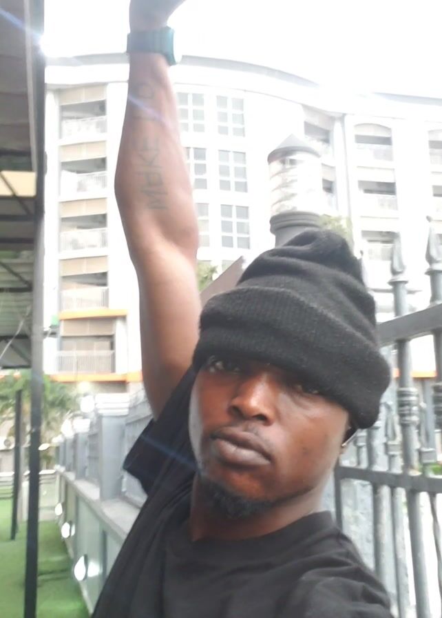 A person with brown skin, a black beanie, and a black t-shirt is positioned outdoors. The person's left arm is outstretched with the hand raised in a fist. A tattoo on the arm reads "Wake Up". Behind the person is a white building with multiple windows. A black wrought-iron fence is also visible. The sky is bright, suggesting daylight.