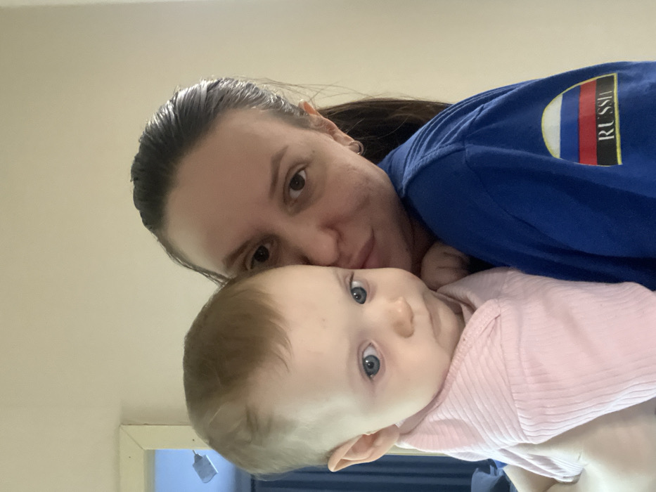 An adult female is depicted holding an infant in an indoor setting. The adult, with dark hair pulled back, wears a blue t-shirt adorned with a Russian flag patch on the right sleeve, displaying white, blue, and red horizontal stripes and the word "RUSSIA" in white text on a black bar below. She has a neutral expression with slightly pursed lips, looking towards the camera. The infant, with light-colored hair and blue eyes, is dressed in a light pink, ribbed long-sleeved garment and is held facing slightly away from the adult, looking directly at the camera with a neutral expression. The background is a plain, light-colored wall. A partial doorway or window frame with light-colored trim is visible on the far left, revealing a darker area, possibly a curtain or another room. The specific location within Mytishchi, Russia, cannot be determined from the visual information provided.