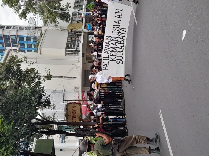 The image depicts a street scene during a parade or public event in Ketandan, Surabaya, Indonesia