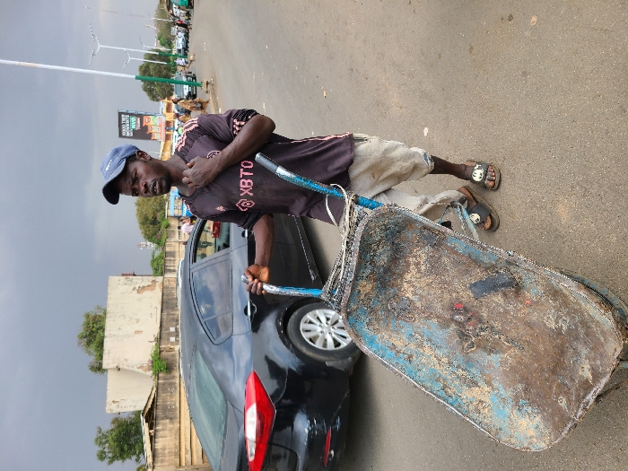 The scene is a paved street in the city of Unknown, Unknown, under an overcast sky. A dark-skinned adult male stands centrally, holding the blue handle of a heavily rusted and dirt-stained blue metal wheelbarrow with his right hand. He wears a blue baseball cap, a dark short-sleeved t-shirt with pink shoulder stripes and a white 'XBTO' logo on the chest, light-colored baggy shorts/trousers, and dark sandals. His left hand is raised to his neck/collarbone area, and he looks slightly to his right with a serious expression. To his immediate left, a black sedan is partially visible. The background features a paved road extending into the distance, lined with modern streetlights, a large billboard displaying partially legible text including "GOOD TIME MOMENTS HAVE", and various indistinct pedestrians and vehicles. Structures and green foliage are visible under the uniformly grey, cloudy sky.
