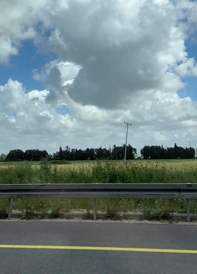 view from a moving vehicle, likely a car, traveling on a highway. A yellow line marks the edge of the asphalt road, and a gray metal guardrail separates the road from the adjacent field. Beyond the guardrail, a green field stretches towards a line of trees in the distance. A single utility pole stands in the field. In the far background, a cityscape with tall buildings is visible. The sky is blue with scattered white clouds. The video is taken during daylight.