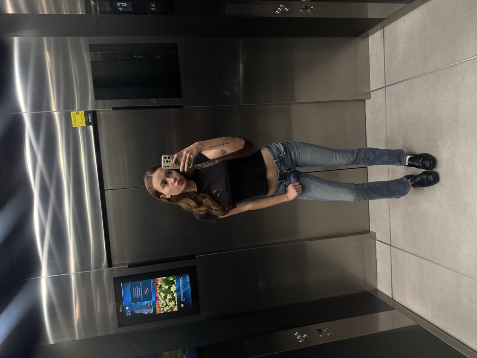 A woman stands in an elevator, taking a selfie. She wears a black shirt, blue jeans, and black shoes with white socks peeking out. She holds her phone in her right hand, her left hand is in her jeans pocket. The elevator interior is stainless steel. A screen displays a graphic, and elevator buttons are visible. The floor is tiled. The image is rotated counter-clockwise.