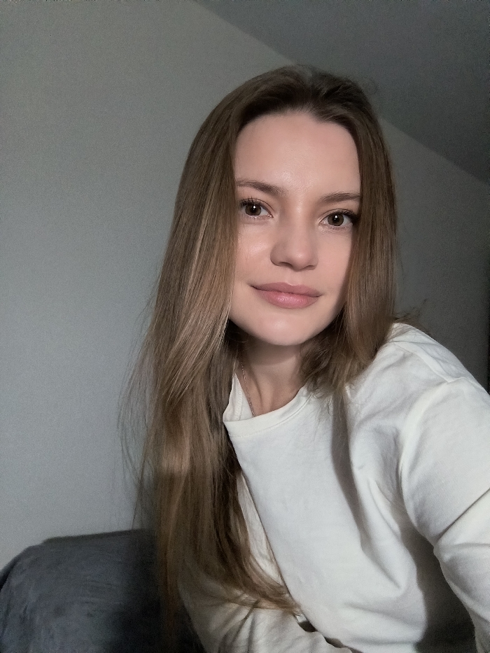 A female with long, light brown hair, parted in the middle, occupies the majority of the frame, looking directly at the camera with a neutral expression and a slight smile. She has brown eyes and fair skin, with subtle facial makeup. A thin silver-colored chain necklace is visible around her neck. She is wearing an off-white, long-sleeved crew-neck shirt. In the lower-left corner, a portion of dark grey fabric, possibly a blanket or upholstery, is visible. The background consists of a plain, light grey wall, with a slight angle or shadow indicating a corner or sloped ceiling in the upper right. The lighting is soft and even. The exact location within the city of Vinnytsia, Ukraine, cannot be determined from the visual information present in the image.