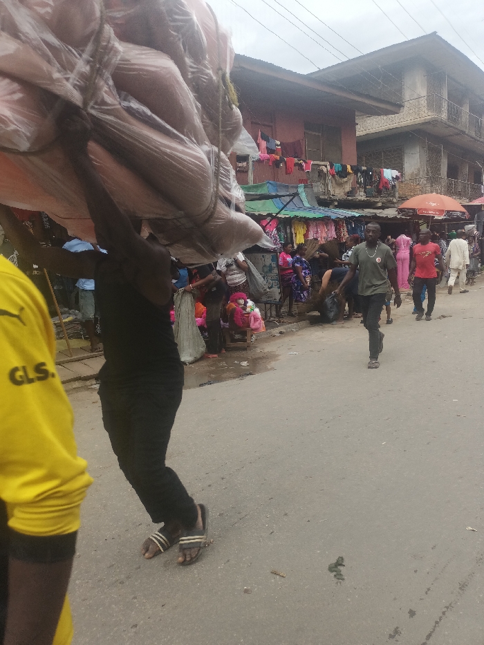 The image captures a busy street scene in Unguwar Kaya, Nigeria, under an overcast sky. In the immediate foreground, the left shoulder and arm of an individual wearing a yellow shirt with "GLS." printed in black are visible. Directly behind this individual, a dark-skinned man walks from right to left, carrying a substantial, irregularly shaped load of items wrapped in translucent plastic, secured with ropes, balanced on his head. He is dressed in a black tank top, black trousers, and black slide sandals with white stripes, with his arms partially raised to steady the load. The street surface is asphalt, grey and appears worn, with minor debris scattered. Multiple pedestrians occupy the midground. A dark-skinned man in a dark green t-shirt with a light-colored pendant and dark trousers walks forward, slightly right of center. Further down the street, another man in a red t-shirt walks away from the viewer. Market stalls line the right side of the street, displaying an array of colorful clothing items hanging from racks under green and blue tarpaulin awnings and a prominent orange market umbrella. Several individuals are present among the stalls, appearing to be vendors and shoppers; one person is bent over near a stall. The background features two multi-story buildings. The building on the left is reddish-brown, with clothes visibly hanging to dry from a second-story balcony. To its right, a light grey concrete building, also two stories, features balconies with metal railings. Overhead utility lines are visible against the sky.