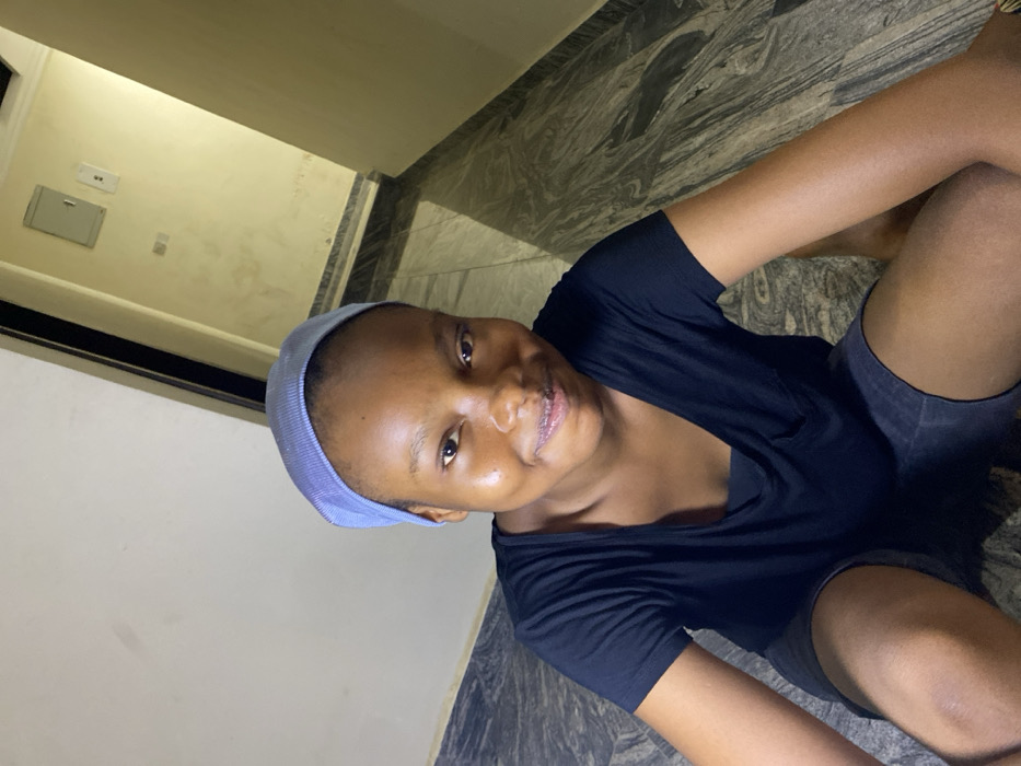 - "A woman in a blue head covering, dark-colored t-shirt, and shorts sits on a marble-tiled floor, looking up at the camera with a slight smile" by FM-4e3eB3, licensed under CC BY 4.0
