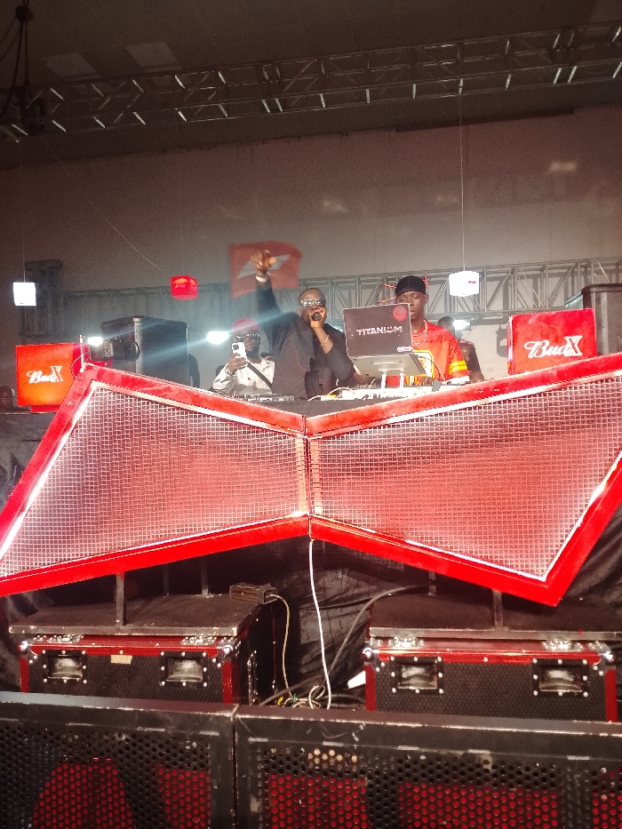 A stage setup features three individuals behind DJ equipment. The person on the left holds a phone. In the center, a man in a black suit is speaking into a microphone and raising a flag. To the right, another person is wearing an orange shirt. A laptop with “TITANIUM” written on it sits on the table. Two “BudX” signs are visible. The setup includes red-framed speakers and black, metal-caged speakers below. Overhead, industrial lighting is suspended.