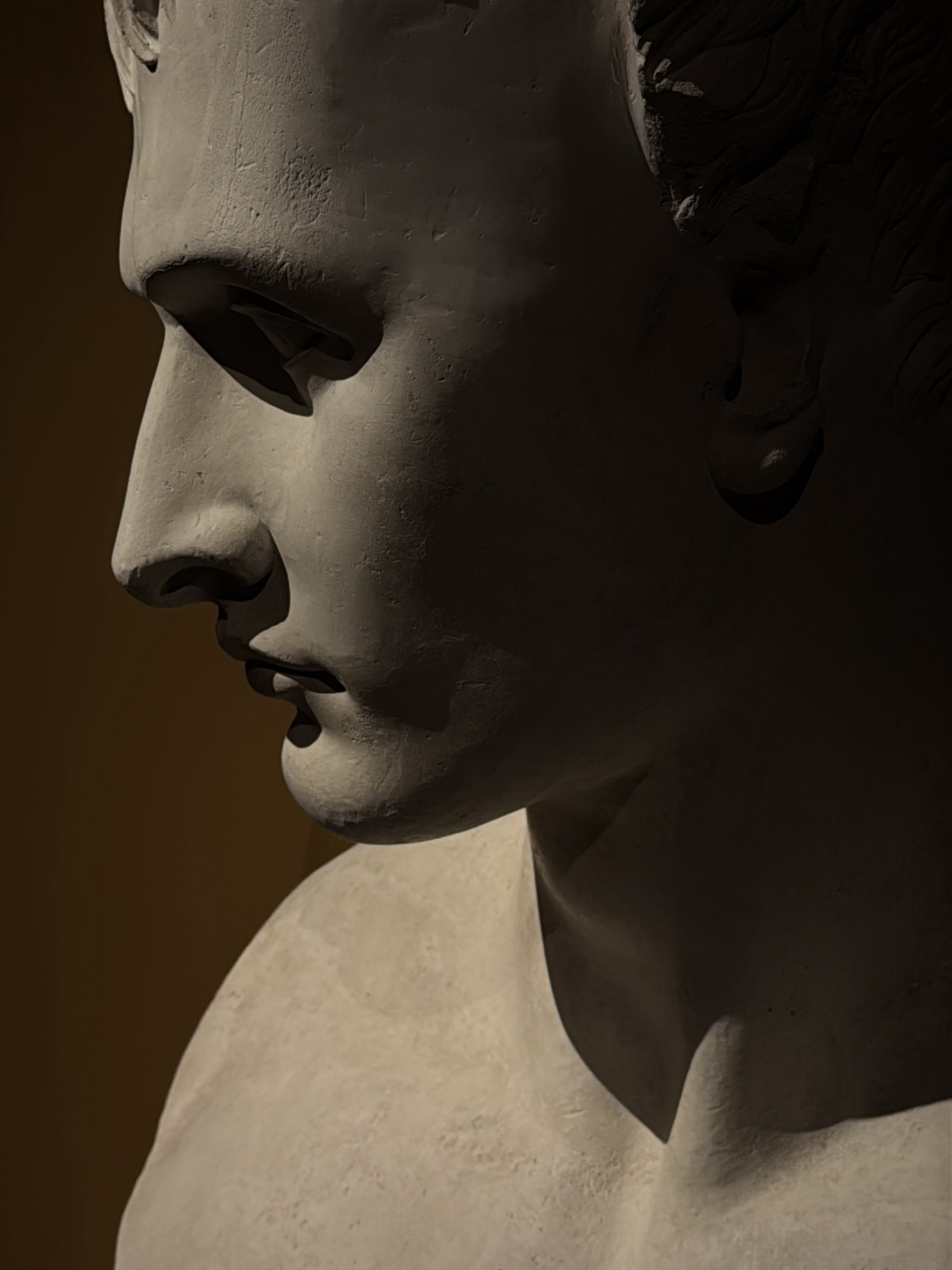 A forensic description of the scene depicts an off-white plaster cast of Antonio Canova's "Napoleon as Mars the Peacemaker," located in the Pinacoteca di Brera, Milano, Italy. The subject is a male figure, captured in a tight profile view, facing the viewer's left with a slightly downward gaze. Strong directional light illuminates the left profile, clearly detailing the sculpted nose, upper lip, chin, and a portion of the left shoulder and clavicle. The right side of the face, neck, and upper torso is cast in deep shadow, obscuring features on that side. The background is a uniform dark brown, suggesting an indoor, controlled exhibition environment. No living persons, actions, or interactions are present.