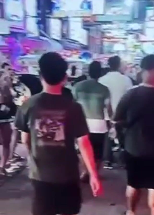 The video depicts a busy street scene in what appears to be a nightlife district, possibly in Southeast Asia