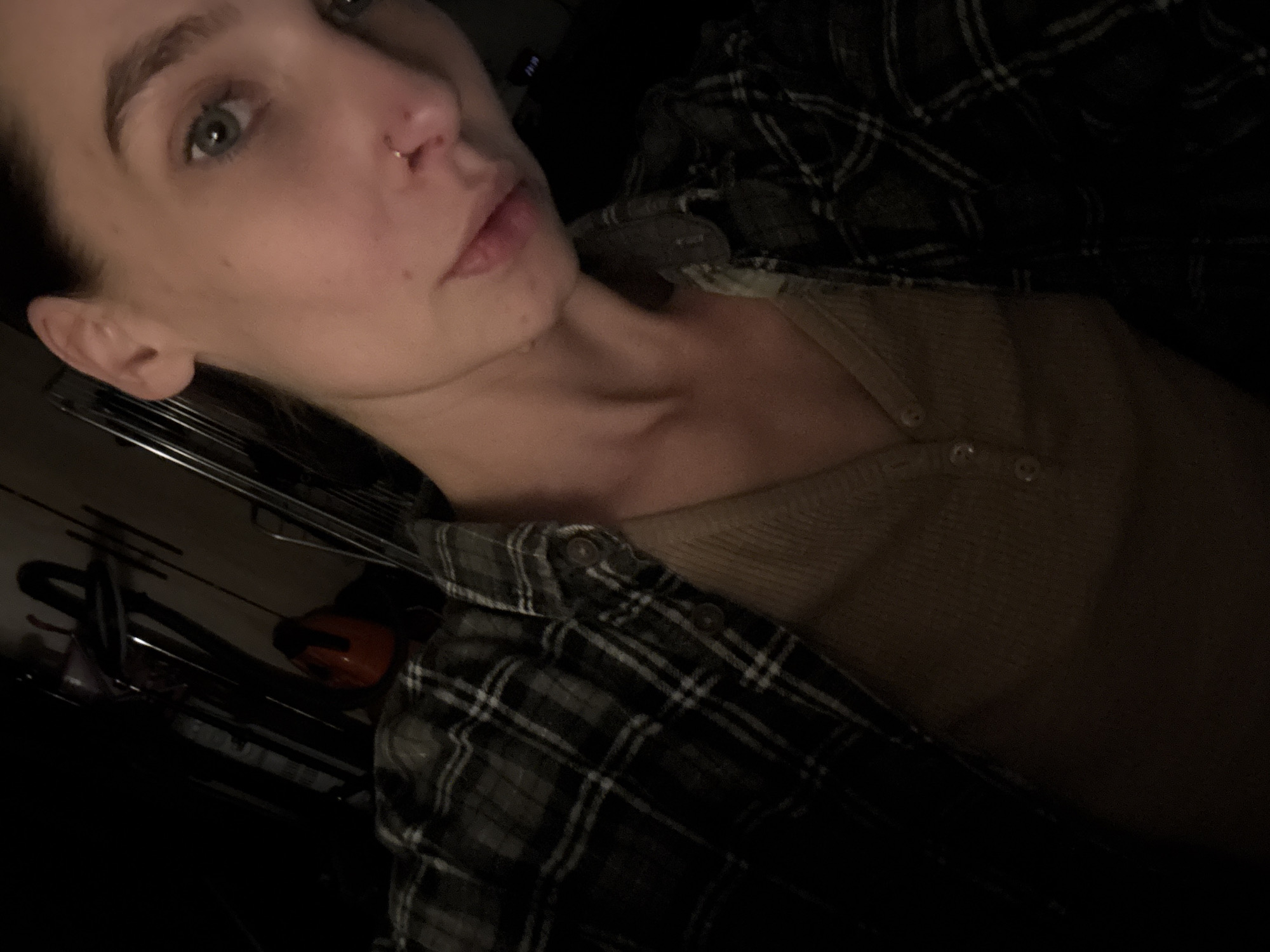 The image displays an adult female subject, located indoors in the city of Bat Yam, Israel. The shot is a close-up, capturing her upper torso and face in a dimly lit environment. She wears a dark grey and black plaid button-up shirt, which is unbuttoned over a light brown or beige ribbed Henley-style top featuring three visible buttons. A small, gold-colored hoop nose ring is present in her left nostril. Her gaze is directed straight into the camera, and her eyes appear light-colored. The background is dark and out of focus, revealing several indistinct objects. Visible items include a dark, vertical metallic structure, consistent with a bicycle frame, and a small, bright orange object, possibly a helmet, situated to the viewer's left in the mid-ground. The overall scene is characterized by low light conditions.