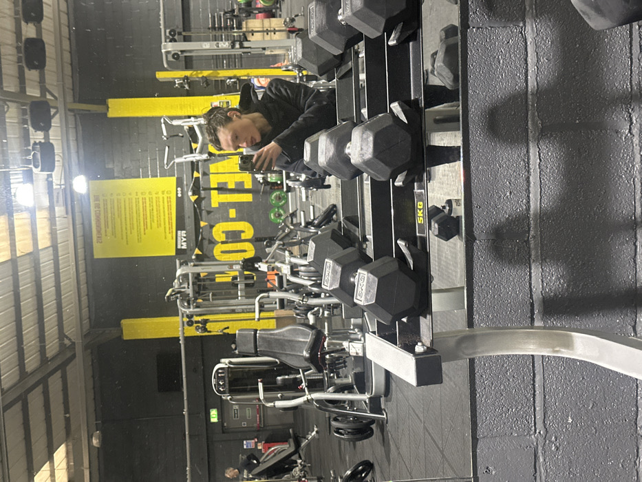 The image depicts a mirror reflection of an indoor gymnasium, identified as Planet Fitness, located at Unit 4 Longfield Road, Tunbridge Wells, TN2 3EY, United Kingdom. The primary subject, a young adult with dark, curly hair pulled back, is visible from the chest up, wearing a black hooded top. They are holding a black smartphone in their right hand, directed towards themselves, suggesting the capture of a selfie or video. In the immediate foreground, a black metal dumbbell rack holds multiple black hexagonal dumbbells. At least three dumbbells on the top shelf are clearly visible, each marked "5KG" in yellow text. The gym environment features dark grey, possibly cinder block, walls and prominent yellow vertical structural columns. The ceiling is industrial, with exposed metal framework and overhead fluorescent lighting fixtures. The background, viewed through the mirror reflection, displays various pieces of fitness equipment, including multiple weight machines, cable machines, and benches. A large yellow sign on the far wall, visible in reverse, features text including "THE COMMANDMENTS" and the "PLANET.CO" branding. Another smaller yellow sign below "THE COMMANDMENTS" also appears in reverse with "MYR" visible. An emergency exit sign with a green running man pictogram is visible above a doorway on the left side of the reflection. A second individual, wearing a dark shirt, is partially visible in the far left background, reflected standing near a weight bench. The floor is covered with black rubber gym matting.