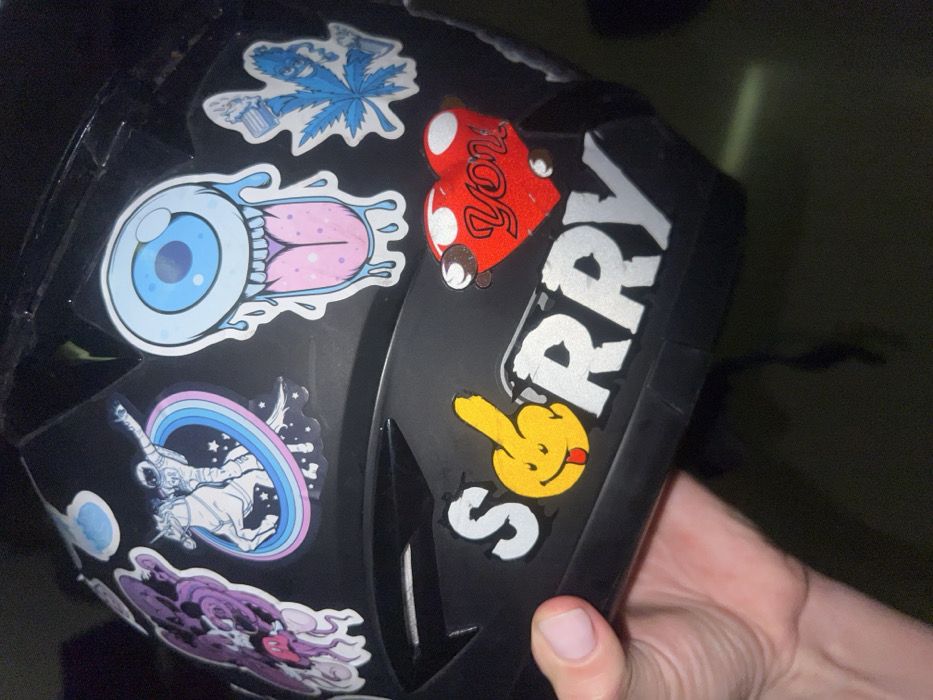 A black motorcycle helmet is held by a left human hand in a dimly lit environment. The helmet is extensively adorned with various stickers. On the upper surface, from left to right, a purple, multi-tentacled creature sticker is visible. Adjacent to it, a white astronaut riding a white unicorn is depicted mid-gallop over a rainbow arc of light blue and pink. To the right, a sticker shows a light blue eyeball with a dark blue pupil and iris, dripping liquid, with a pink tongue protruding below it. Further to the right, a blue cannabis leaf features a cartoon character holding a beer mug. On the lower section of the helmet, the word "SORRY" is spelled out in reflective white block letters. The letter "O" in "SORRY" is replaced by a yellow, emoji-like character with a red tongue, making a middle finger gesture. To the right of "SORRY," a red heart-shaped sticker with small white polka dots has the word "You" written in black script. The human hand, displaying light skin tone and short fingernails, grasps the left side of the helmet. The background is uniformly dark and indistinct. The specific location within the city of Peliatan, Indonesia, cannot be determined from the visual evidence in the image.