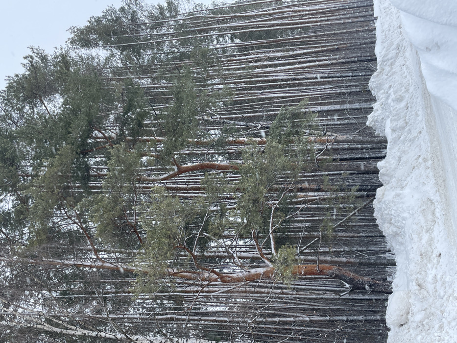 This image depicts a winter forest scene in Zav'yalovo, Russia. In the foreground, a narrow, dark path, likely a road or track, is partially visible, bordered by substantial, irregularly shaped piles of freshly fallen snow. Beyond these snowdrifts, a dense forest occupies the midground and background, extending upwards to the overcast sky. The forest consists primarily of tall, slender trees. Prominently featured are several coniferous trees, identifiable as pines, with visible reddish-brown bark and dark green needles, their branches lightly dusted with snow. Interspersed among these and forming a dense backdrop are numerous deciduous trees, likely birches, with lighter-colored, almost white, snow-dusted bare trunks and branches. Light snowfall is observable throughout the scene, manifested as small white specks against the darker trees and muted sky. No individuals or animals are present.
