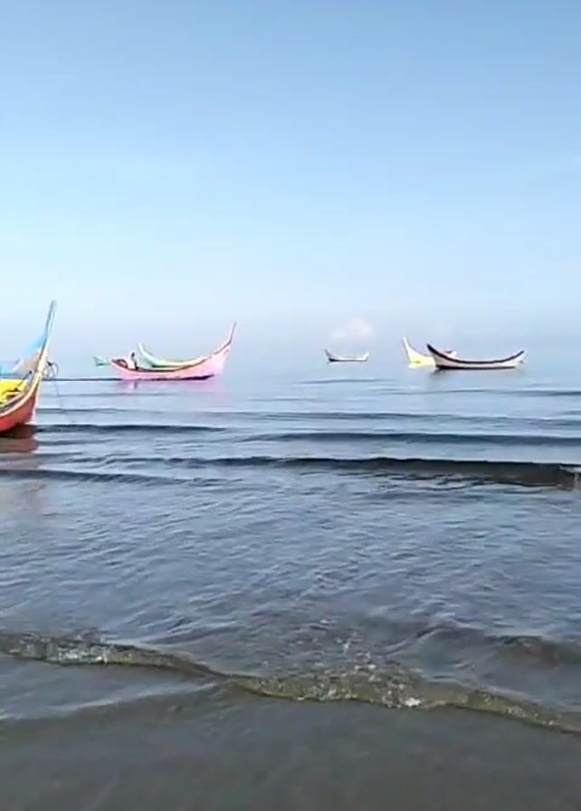 ocean shore with several boats in the water. The water is calm and blue, with gentle waves lapping on the shore. The boats are of various colors, including pink, yellow, and blue. The sky is clear and blue. One person is visible on one of the boats.