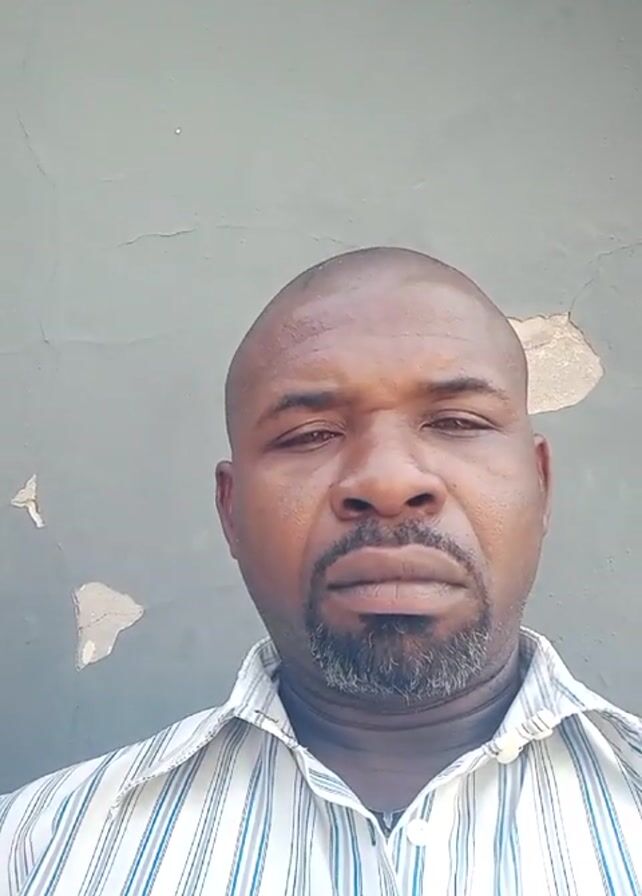 headshot of a middle-aged, Black man against a cracked gray wall. He has a bald head, dark brown skin, and a salt-and-pepper goatee. He is wearing a white and light blue striped collared shirt. His expression is neutral. The camera is still.