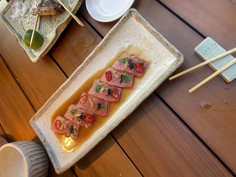 - "A rectangular plate showcases several pieces of sashimi, garnished with red chili slices, small herbs, and black seeds, soaking in a light brown sauce" by FM-IPJUW2, licensed under CC BY 4.0