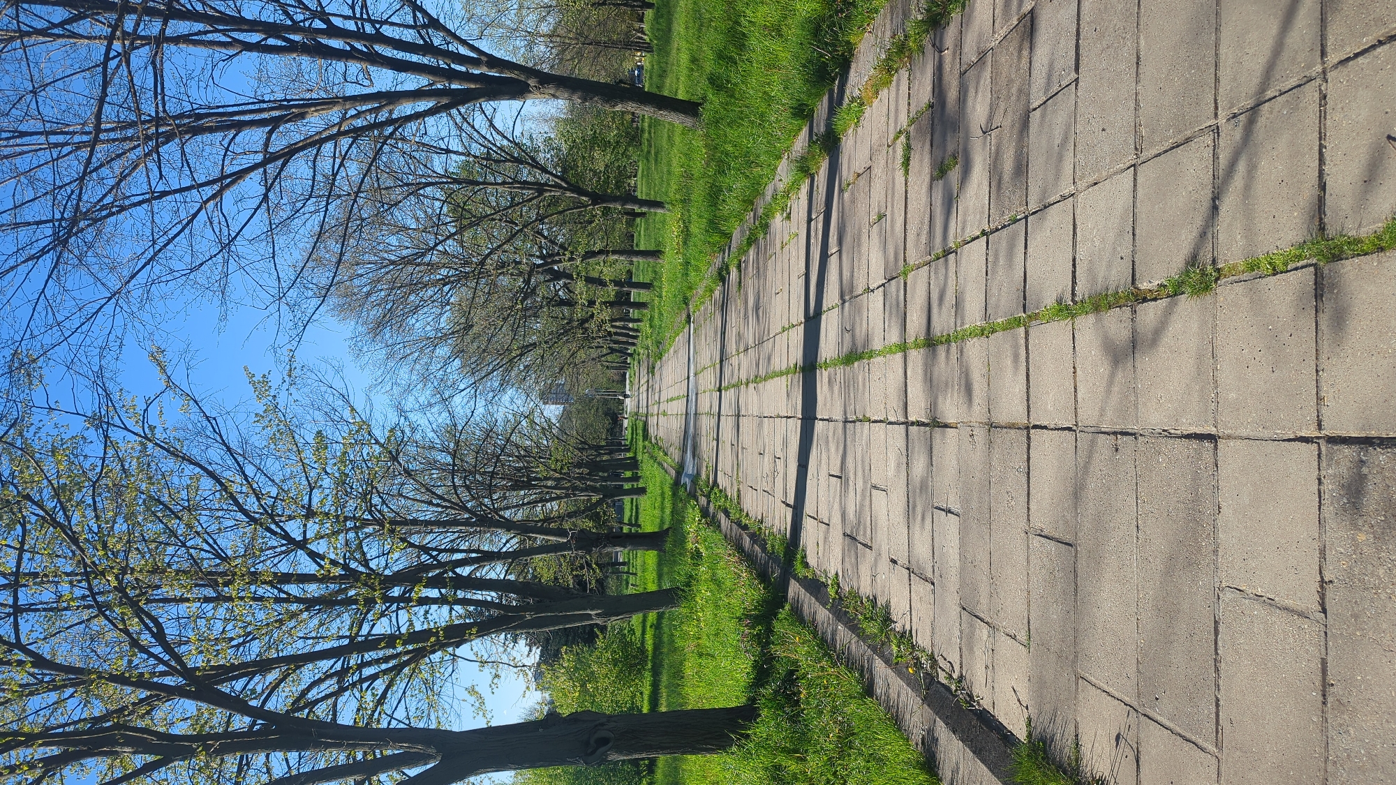 The image depicts a long, straight pathway made of concrete blocks in the city of Dobrich, Bulgaria