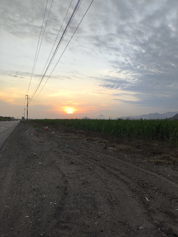 The scene depicts a semi-rural landscape near Laredo, Peru, at sunset. A paved asphalt road occupies the left side of the frame, bordered by a wide, dark dirt shoulder on the right, displaying tire tracks and scattered debris, including light-colored plastic bags. To the immediate right of the dirt shoulder, an expansive agricultural field contains dense, vibrant green crops, likely corn, standing approximately 1 to 1.5 meters tall. Multiple wooden utility poles with numerous overhead power lines extend along the road on the left; a single, small, dark figure is faintly visible on the paved road in the distant midground, appearing to be on a motorcycle or bicycle. The setting sun, a bright orange-yellow orb, is positioned low on the horizon, slightly left of center, illuminating a partly cloudy sky with warm hues directly above the sun, gradually transitioning to cooler grays and blues higher up. Distant mountains are silhouetted against the horizon in the background.