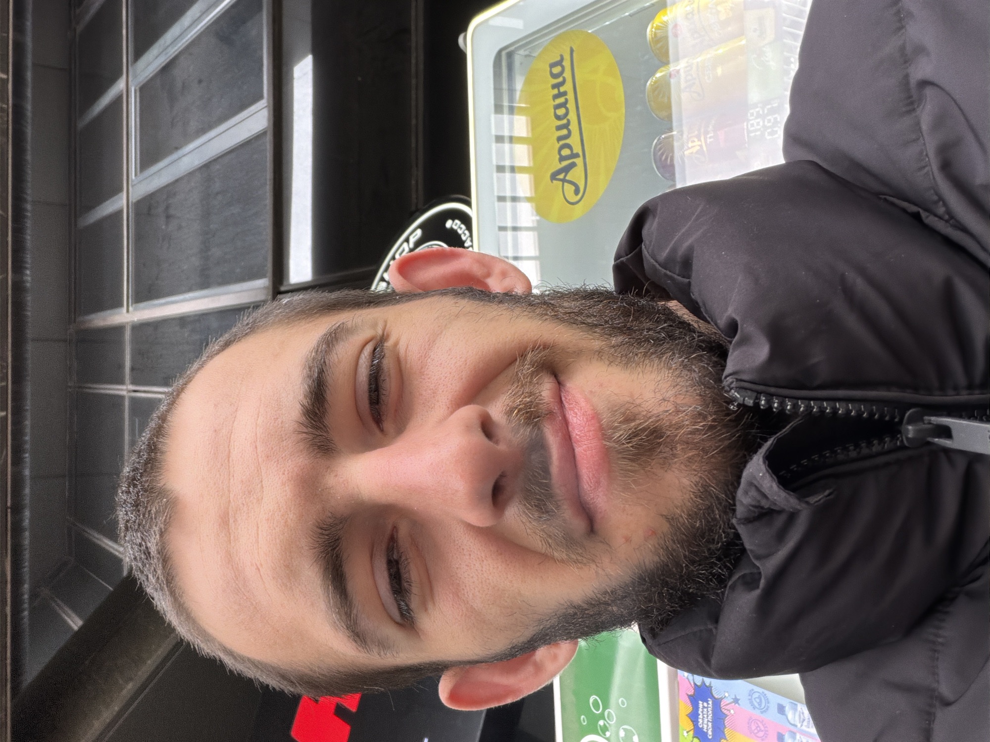 The image displays a close-up selfie of a young adult male. He has short, dark hair with visible graying at the temples, a full dark beard and mustache, and a light-to-medium skin tone. His eyes are narrowed, and his mouth forms a slight, asymmetrical smirk, with the left corner raised. Red blemishes are visible on his lower left cheek/chin area. He is wearing a black, high-collared puffer jacket, zipped. The background elements indicate an urban commercial setting in Bulgaria. To the male's right, a glass-fronted commercial refrigerator or display case contains multiple yellow-capped bottles or cans. A prominent yellow oval logo on the glass clearly displays "Ариана" (Ariana) in Cyrillic script, identifying a Bulgarian beer brand. Below the beverages, a digital readout shows "1.89" and "0.97," likely prices in Bulgarian Leva. To the male's left, a portion of a green sign with white circular patterns and obscured Cyrillic text is visible. Above the male, a dark building facade with multiple reflective, segmented windowpanes is present. A black sign with partial white Cyrillic text, including "ТЮТЮН" (Tobacco), is visible behind his right ear. A red illuminated sign is partially visible on the upper far left. Based on the Bulgarian branding ("Ариана"), Cyrillic script, and currency indicators, the scene is definitively located in Bulgaria. While the specific street address or precise building within Plovdiv, Bulgaria, cannot be pinpointed from the visual details provided, the overall environment is consistent with a commercial street or kiosk area within a Bulgarian city like Plovdiv.