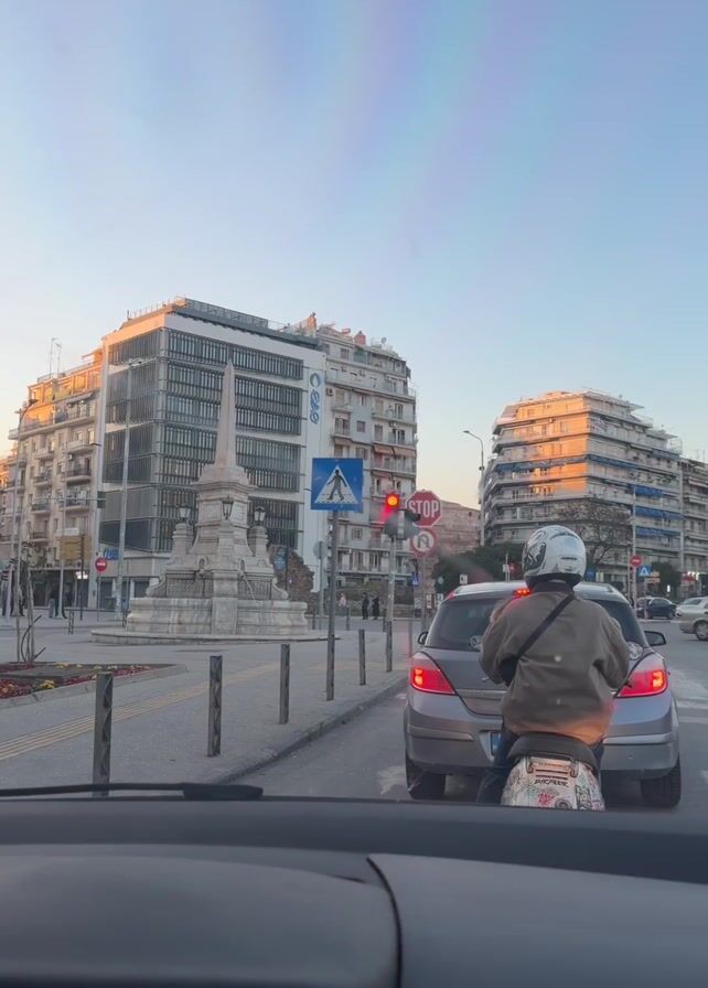 street scene viewed from inside a car. A person on a moped is stopped in front of the car at a traffic light. In the background, there are buildings, a fountain, and street signs. The traffic light is red. The sky is clear and blue. The sun is setting, casting a warm glow on the buildings.
