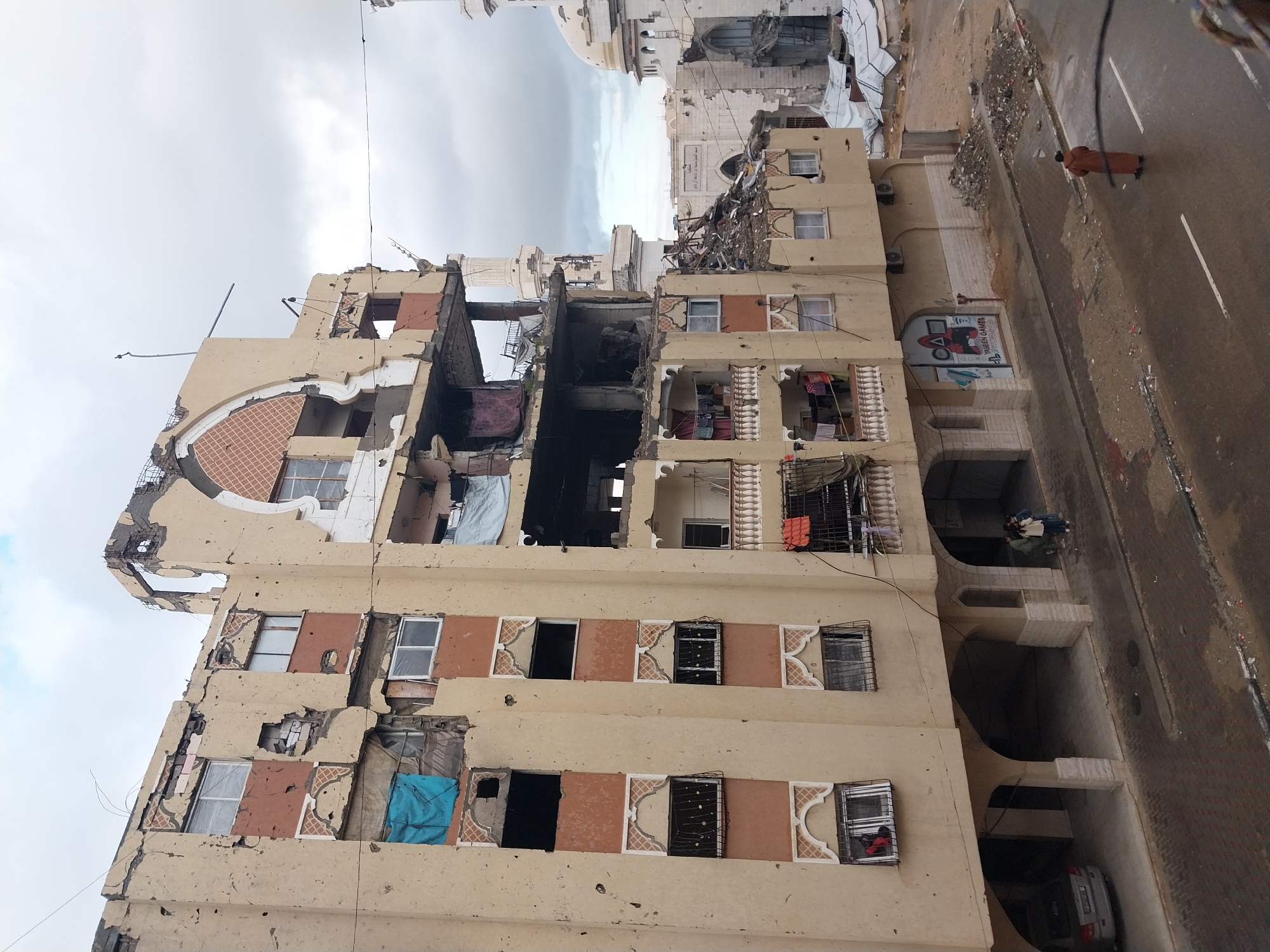The image depicts a street scene in Khan Yunis, Palestinian Territory, centered on a heavily damaged multi-story residential or commercial building under an overcast sky. The building's light beige facade is pockmarked with numerous small holes, indicating bullet or shrapnel damage, and large sections of its outer walls are missing, exposing internal structures and rebar, particularly on the upper floors. Windows are either shattered, absent, or partially covered with blue tarpaulins. Laundry hangs from balconies on the lower, less damaged floors. The ground level features arched recesses, with one section displaying a "YASEEN GAMES" sign featuring PlayStation and "Squid Game" graphics. Three individuals are conversing near an arched entrance on the ground floor. A silver sedan is parked under an arch on the far left. The street in front is wet asphalt with a visible white lane marker and scattered piles of rubble and dirt on the sidewalk. A lone individual in a long brown coat walks in the street on the right. In the background, a white mosque with a dome and a tall minaret is visible, also appearing damaged with debris on its roofline and structural compromise evident. A black power line or cable crosses the upper mid-ground of the image.