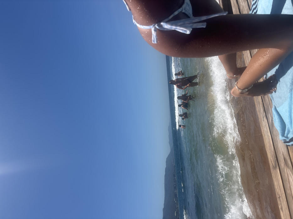 A summer beach scene shows a clear blue sky and the ocean meeting the shore. Several people are wading in the water, moving further out to sea. A person in a light-colored bikini stands on a wooden structure near the edge of the water. Waves are visible, crashing onto the shore. A blue towel is partially visible, draped over the wooden structure. The camera angle is slightly tilted.
