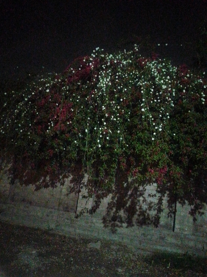 The scene is an outdoor, nighttime view located in Peshawar City Tehsil, Pakistan. A large, dense flowering plant, displaying green foliage interspersed with numerous small white and reddish-pink blossoms, occupies the upper two-thirds of the frame. The plant is situated against a light-toned, textured wall that spans the lower half of the image. Artificial illumination from an unseen source casts sharp, elongated shadows of the plant onto the wall. The immediate foreground consists of dark, indistinct ground cover. No individuals or discernible actions are present.