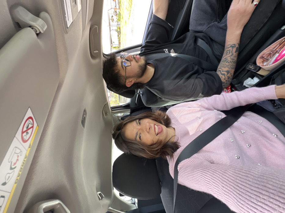 The image depicts the interior of a vehicle in Casco Urbano, Colombia, during daylight hours. Two adults are seated in the front. On the left, an adult female with medium-length brown hair wears a light pink, ribbed long-sleeved sweater adorned with small, reflective studs. She has a playful expression, with her tongue slightly extended and mouth open. A black seatbelt is fastened across her chest. On the right, an adult male with a mullet hairstyle, eyeglasses, and facial hair is driving. He wears a dark, short-sleeved t-shirt with a light-colored logo on the chest, and a black seatbelt. His visible left forearm is extensively tattooed with geometric patterns. He is looking forward, concentrating on driving. The car's interior features a light-colored headliner, with an airbag warning label visible on the passenger sun visor. Black fabric seats are present. Between the front seats, a black storage organizer contains items including a pink makeup brush case and a foundation bottle. Through the vehicle's windows, an outdoor environment is visible, displaying green foliage and a light-colored building, possibly a plant nursery or commercial greenhouse, suggesting a semi-urban or suburban setting.