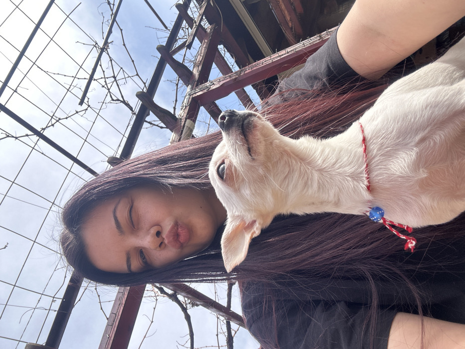 - "An outdoor, eye-level photograph captured in Skala, Bulgaria, features a young adult female and a small dog" by FM-GIf9Q2, licensed under CC BY 4.0