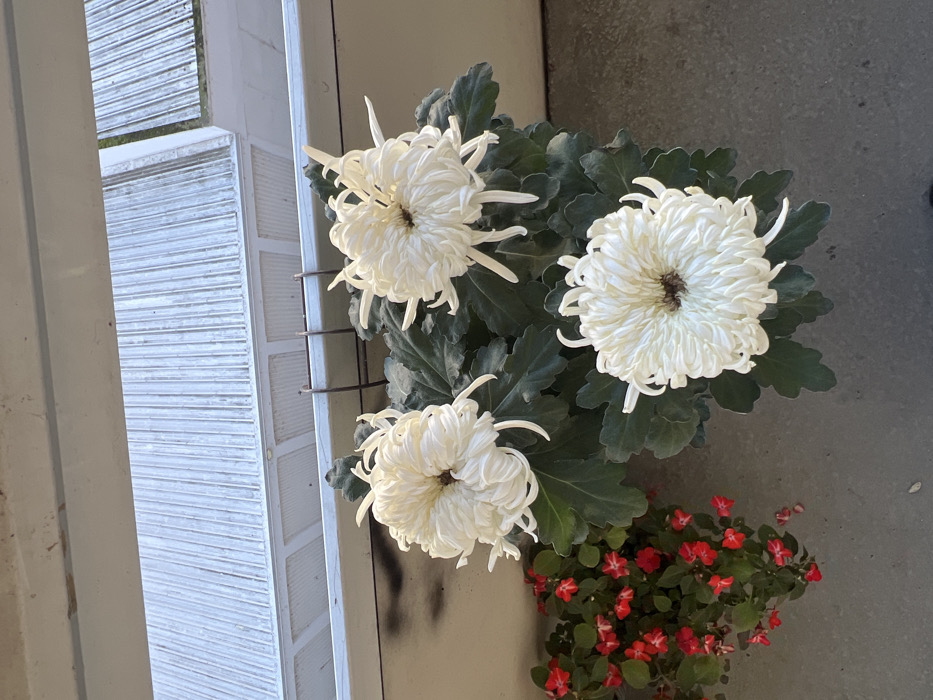 An outdoor scene, likely on a balcony or patio in Strasbourg, France, is captured from a high angle. The primary focus is on three large, fully bloomed white chrysanthemum flowers, characterized by their dense, multi-layered petals. These flowers are part of a plant with dark green foliage, housed in a planter suspended by two brown metal hooks from a light-colored overhead structure. To the left of the central chrysanthemum, an irregular dark smudge or mark is visible on the light-colored structure. Below and to the left of the chrysanthemums, a separate cluster of smaller, vibrant red flowers with pale centers grows in a pot. The ground surface directly beneath the plants is a flat, uniform light gray material, possibly concrete. In the upper background, a corrugated metal roof or awning is visible above a horizontal panel with rectangular detailing. The scene is devoid of human presence.