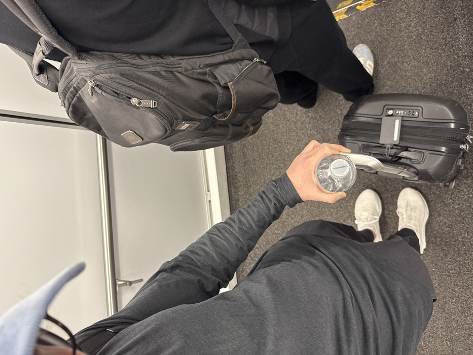 The image depicts two individuals within what appears to be a public transit station or airport terminal in Boston, Massachusetts. The flooring is a dark grey, speckled commercial carpet. The background consists of a plain white wall with a dark baseboard, featuring two parallel horizontal brushed metal railings. On the left, a person wearing a light blue baseball cap, dark-rimmed glasses, a dark long-sleeved shirt, dark pants, and white athletic shoes is partially visible. Their right arm is extended, holding a clear plastic water bottle with a blue and white cap, positioned downwards towards a piece of luggage. Centered in the lower portion of the frame is a dark-colored, hard-shell rolling suitcase with its telescopic handle partially extended. A combination lock and a dark tag are attached to the suitcase. On the right, a second person is partially visible, wearing a dark top, dark pants, and light blue and white athletic shoes. A black backpack, identifiable by a brown TUMI logo patch, is worn on their back. The individuals appear to be standing or waiting in the area.