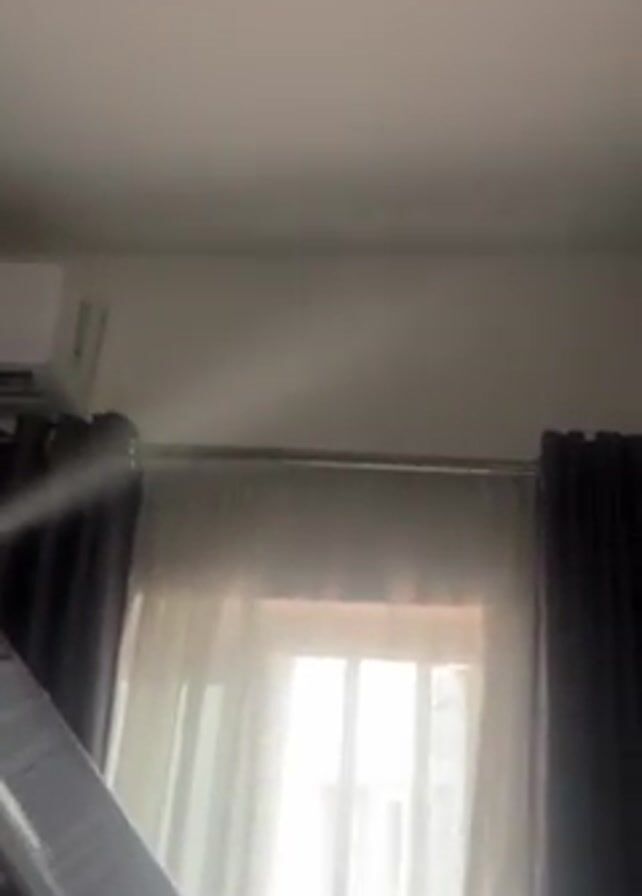 A close-up shot shows someone spraying air freshener in a room. The air freshener, in a purple and white can, is being sprayed upward toward a white wall-mounted air conditioner. The air conditioner is located above a window covered with thin white curtains and darker, heavier purple curtains. The person's hand holding the air freshener is briefly visible. The room has white walls.