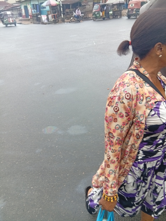 The image displays an active urban street environment within a city in Unknown, Nigeria, following a recent rain. The asphalt road surface is wet, showing multiple iridescent oil slicks. In the immediate foreground, the right profile of an adult female is visible, walking towards the left. Her dark hair is pulled back into a small ponytail secured with a red elastic band, and she wears a golden stud earring. She is dressed in a long-sleeved, light-colored top featuring a multi-colored circular pattern in shades of orange, pink, brown, and cream, over a sleeveless dress or skirt with a white base and a prominent jagged pattern in purple and black. She wears black, open-toed sandals and a stacked, golden-brown beaded bracelet on her right wrist, holding a light blue plastic bag. In the mid-ground, an intersection is visible with various vehicles and individuals. Along the opposite side of the street, several single-story commercial structures or stalls with corrugated metal roofs are present. Transportation includes multiple three-wheeled auto-rickshaws, commonly known as keke napeps: one green and white on the far left, another green one with passengers in the center, and a reddish-brown one further right. A man is seated on a dark motorcycle near the center-left. Other pedestrians and individuals associated with the stalls are also visible. A red and white striped umbrella stands near one of the commercial establishments.