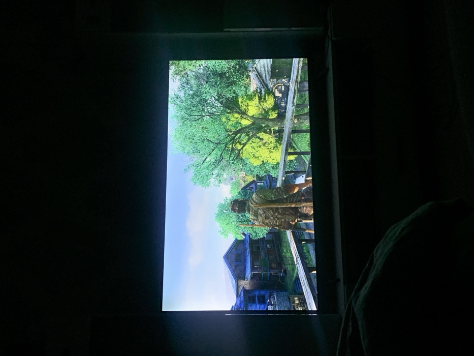 A screen displays a scene from "The Last of Us Part II," showing Ellie walking across a wooden bridge. Lush green trees and foliage surround her, with a dilapidated blue building visible in the background. The bright sky contrasts with the darker environment. The image is taken in a dimly lit room, with only the screen illuminating the surroundings. A part of the person watching the scene is visible on the right of the scene.