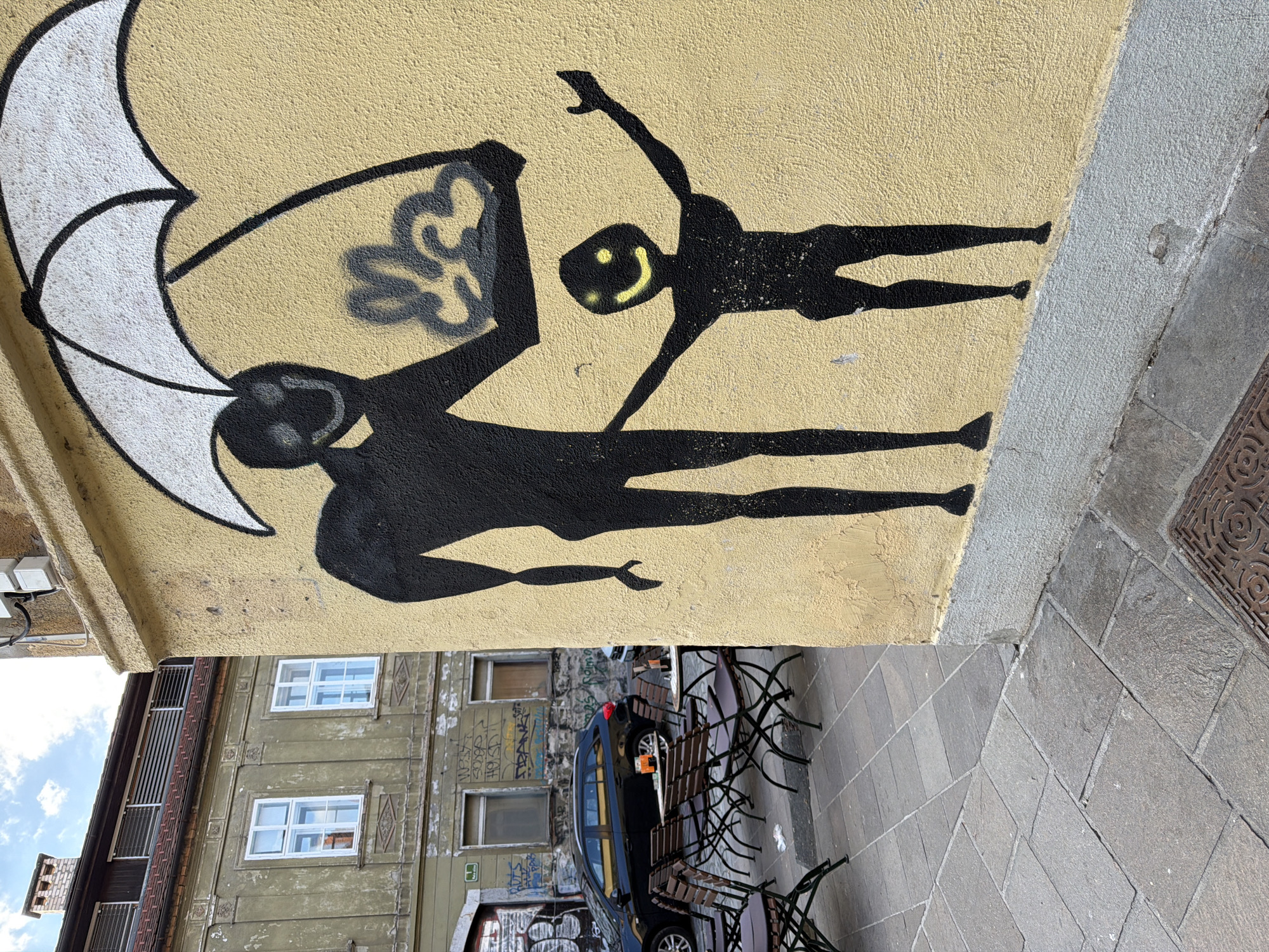 mural on a building in Ljubljana, Slovenia. The mural depicts two black silhouetted figures on a yellow wall. One figure is larger and appears to be holding a white umbrella with a black outline. The second figure is smaller, with a yellow smiley face, and its arms are raised. To the right of the mural, there is a stone sidewalk with a manhole cover. Below the mural, there is a view of buildings across the street, including a building with windows and a black car parked in front. The buildings show signs of aging and some graffiti. There are also metal chairs and tables, presumably belonging to a nearby café.