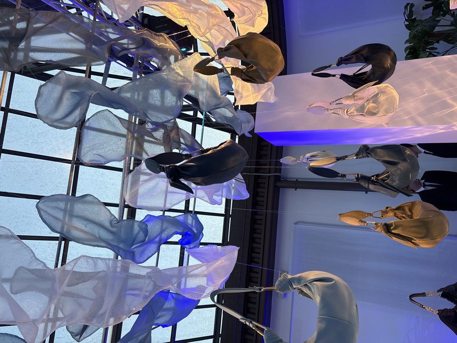 The image depicts a high-ceilinged interior of a large event space in Milan, Italy, characterized by a prominent glass roof. The ceiling, constructed with a dark metal grid framework and numerous rectangular glass panes, allows natural light to filter through, illuminating a suspended artistic installation. This installation consists of various translucent, flowing fabric pieces in shades of light blue, white, and pale gray, draped and undulating, creating a cloud-like aesthetic. Numerous luxury handbags are suspended at varying heights from fine wires within the space, forming a product display or exhibition. These handbags are primarily soft, unstructured, hobo-style or crescent-shaped, in colors including dark green/black, light blue/teal, gold/tan, pale pink/beige, and cream/white. Many feature a distinctive knotted detail on their straps or bodies and incorporate gold-toned metal hardware. One gold/tan bag in the lower central area bears the faint inscription "COCCINELLE," identifying the Italian brand. Artificial lighting, primarily a blue hue, emanates from a tall, white rectangular pillar positioned on the right side of the frame, casting a cool glow on the surrounding fabrics and bags. A similar, less distinct white structure or wall is visible on the left. In the lower central-right area, two individuals, likely men, are partially visible from the chest down, dressed in dark suits with white shirts. They are standing, facing away or to the side, appearing to observe the display. A plant with broad green leaves is partially visible behind the white pillar on the lower right. The overall scene suggests a high-end fashion event or product launch within an architecturally significant indoor venue.