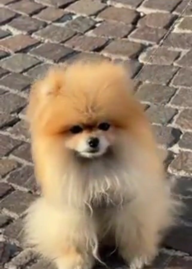 A small, tan-colored Pomeranian dog sits on a cobblestone street, then stands and walks forward with a woman who is holding the leash