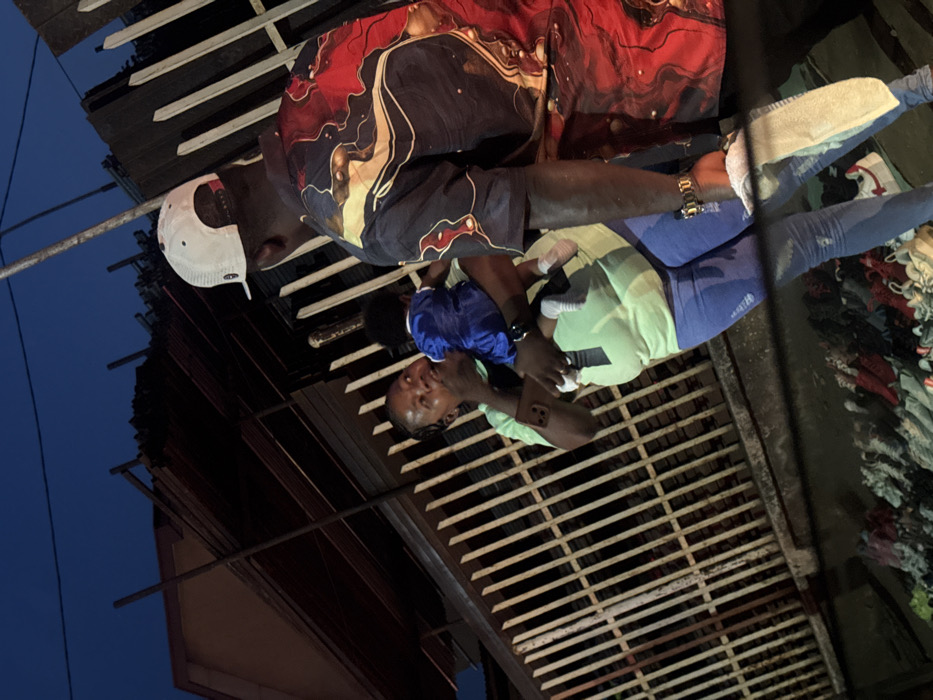 Two adults, one toddler, and a lattice-like structure dominate the scene. An adult wearing a patterned shirt and a white cap holds the toddler. The other adult, possibly female, wears a light green shirt and blue leggings, holding a smartphone. They are positioned near the lattice, which is illuminated. Dark sky and building structure are visible in the background, suggesting an evening or nighttime setting.