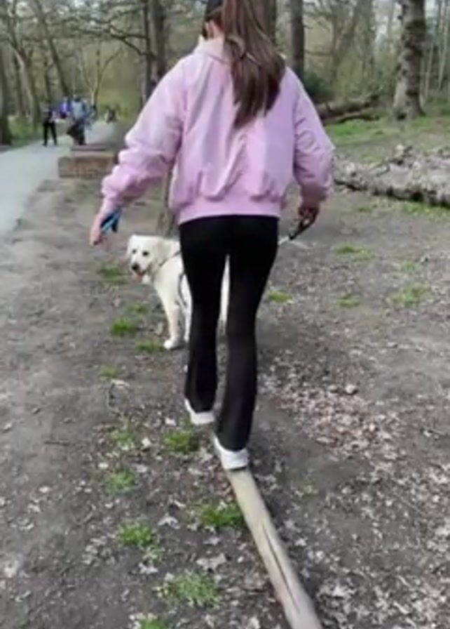 woman and a golden retriever on a walk in the woods. The woman is wearing a pink jacket, black pants, white shoes, and a black baseball cap. Her hair is pulled back in a ponytail. She is walking on a fallen log, using her arms for balance, while her dog is walking on the ground beside her. In the background are other people walking on a path, trees, and leaf litter. The sky appears overcast.