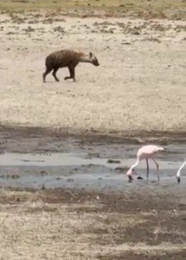 - "hyena walking across dry grassy terrain towards a muddy puddle where two pink flamingos are foraging with their heads down" by FM-ohOUo2, licensed under CC BY 4.0