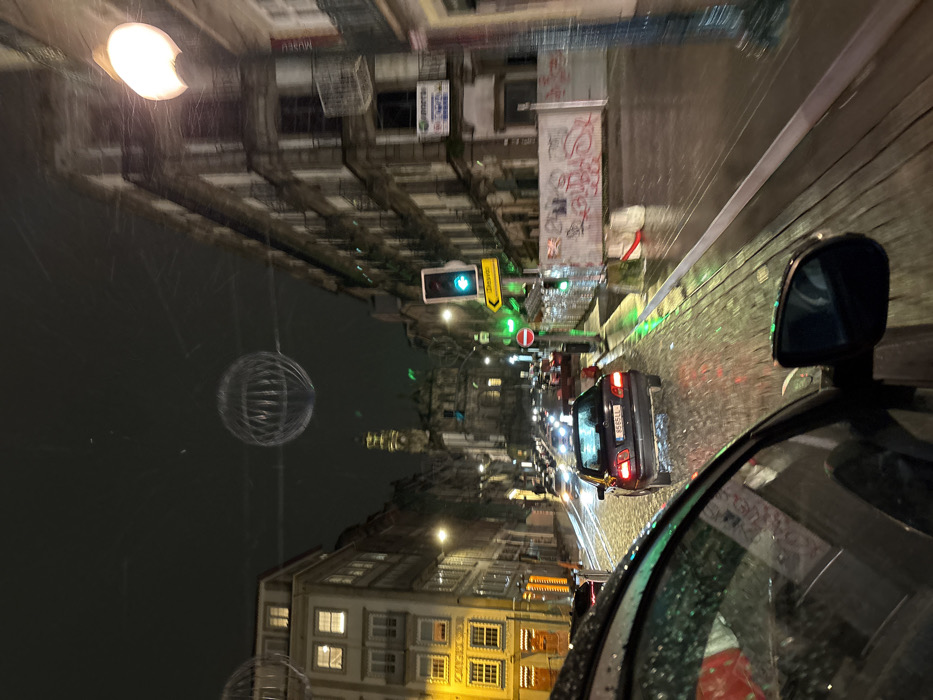 Nighttime street scene from a car's perspective. Raindrops dot the windshield. Buildings line the narrow street, lit by streetlights and building windows. A decorative sphere hangs overhead. A line of cars extends down the street, illuminated by headlights and taillights. A green traffic light is visible above. The car's side mirror is partially visible.