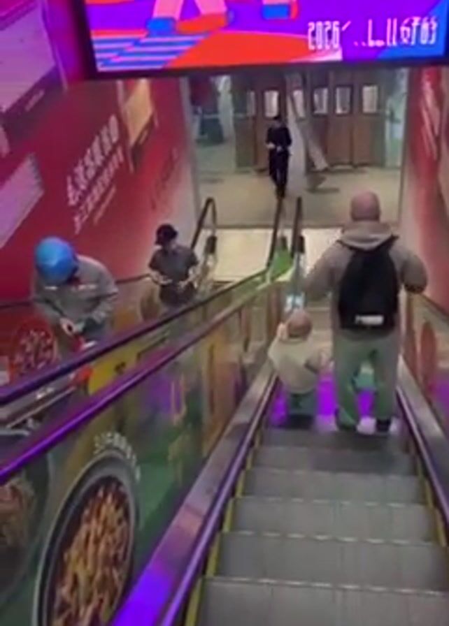 n escalator with three individuals going up. On the left of the escalator, a person in a blue helmet and gray uniform is looking down and appears to be working on something. To their right, another person wearing a cap and face mask is also looking down, possibly at a phone or device. Further up the escalator, a man with a backpack is looking up, while a child, dressed in light-colored clothing, is sitting on the escalator stairs. The background of the escalator is decorated with advertisements, including food and drink images, and a large screen displays colorful graphics with the date "2026 11.11 至16." At the top of the escalator, a woman in dark clothing is walking through a doorway. The escalator is labeled "L1."