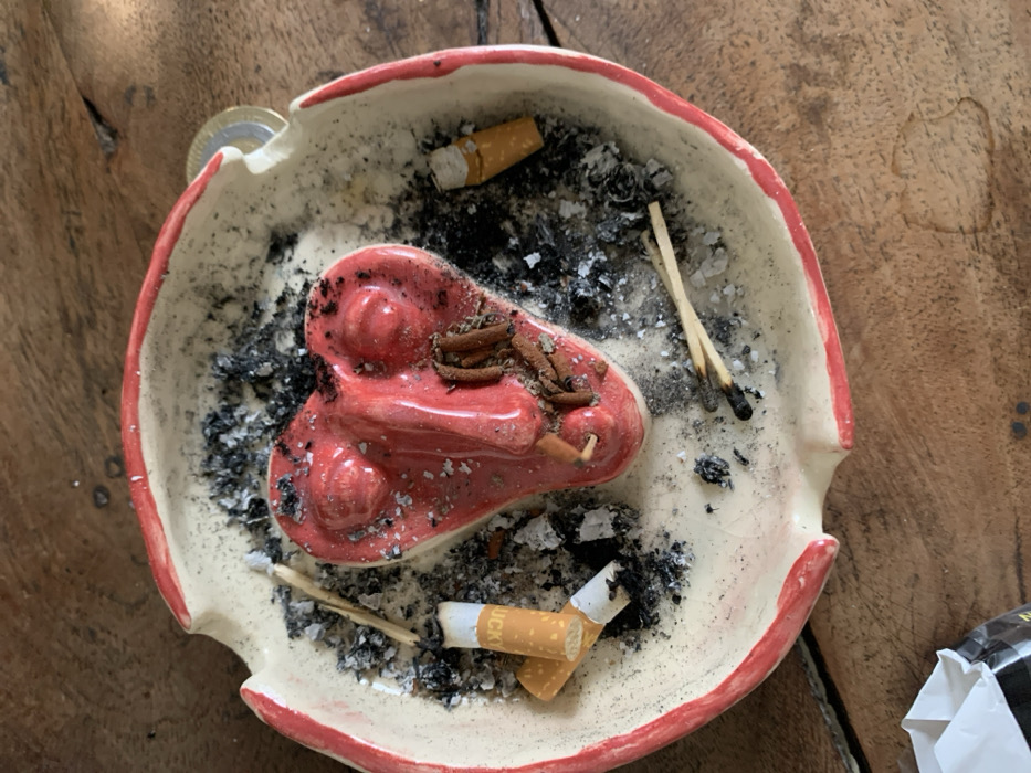 - "The scene, located in Mexico City, Mexico, centers on a well-used, off-white ceramic ashtray with a red rim, resting on a rustic wooden table" by FM-rZOKr2, licensed under CC BY 4.0