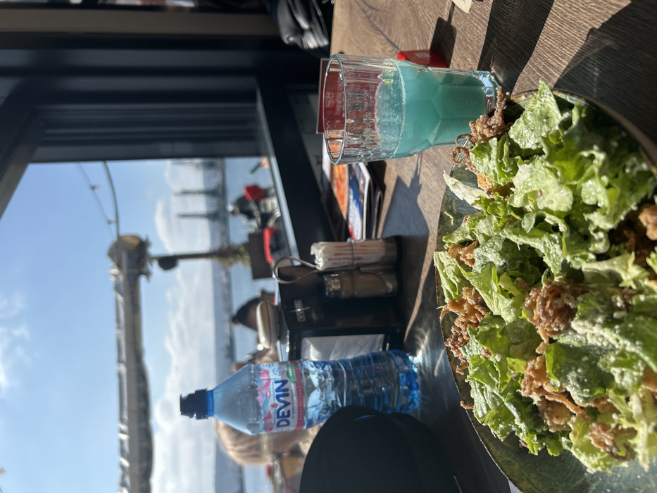 The image captures an indoor dining scene at a restaurant overlooking the Black Sea port in Varna, Bulgaria. In the foreground, on a light brown wooden table, a large, dark green bowl of green salad, adorned with what appear to be fried onions and white dressing, occupies the lower left. To its right, a tall, ribbed glass contains a bright blue beverage. Behind the salad, a plastic bottle of "DEVIN" brand mineral water stands partially consumed. Adjacent to the water bottle, a black napkin dispenser, a pair of metal salt and pepper shakers, and a metal holder with white toothpicks or straws are positioned. A menu or brochure is visible beneath these items. Direct sunlight enters from the left, casting distinct shadows on the table. Through a large, dark-framed window, the midground reveals an outdoor dining area situated next to the water, where several individuals are seated at tables. Above this area, a light-colored canvas awning is partially visible. In the background, across the water, the Varna Port is distinctly marked by two prominent industrial cranes, one yellow and one red, set against a clear blue sky with sparse white clouds. The water itself appears calm. A blurry figure with blonde hair is partially visible within the restaurant, situated behind the Devin water bottle to the left.