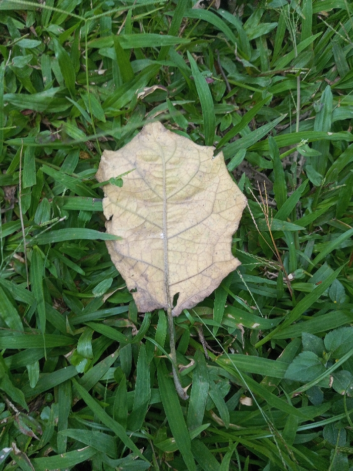 - "A single, desiccated leaf, light tan in color with prominent venation, is centrally positioned on a dense bed of green grass" by FM-65nep1, licensed under CC BY 4.0