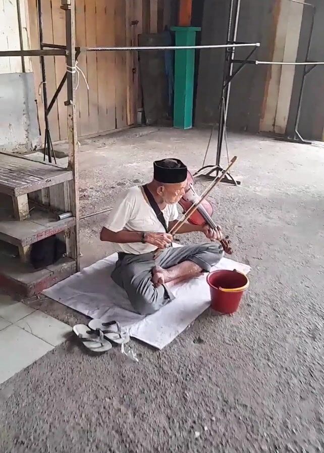 - "An elderly man wearing a white t-shirt and grey pants sits cross-legged on a white cloth on the ground, playing a red violin" by FM-hcL462, licensed under CC BY 4.0