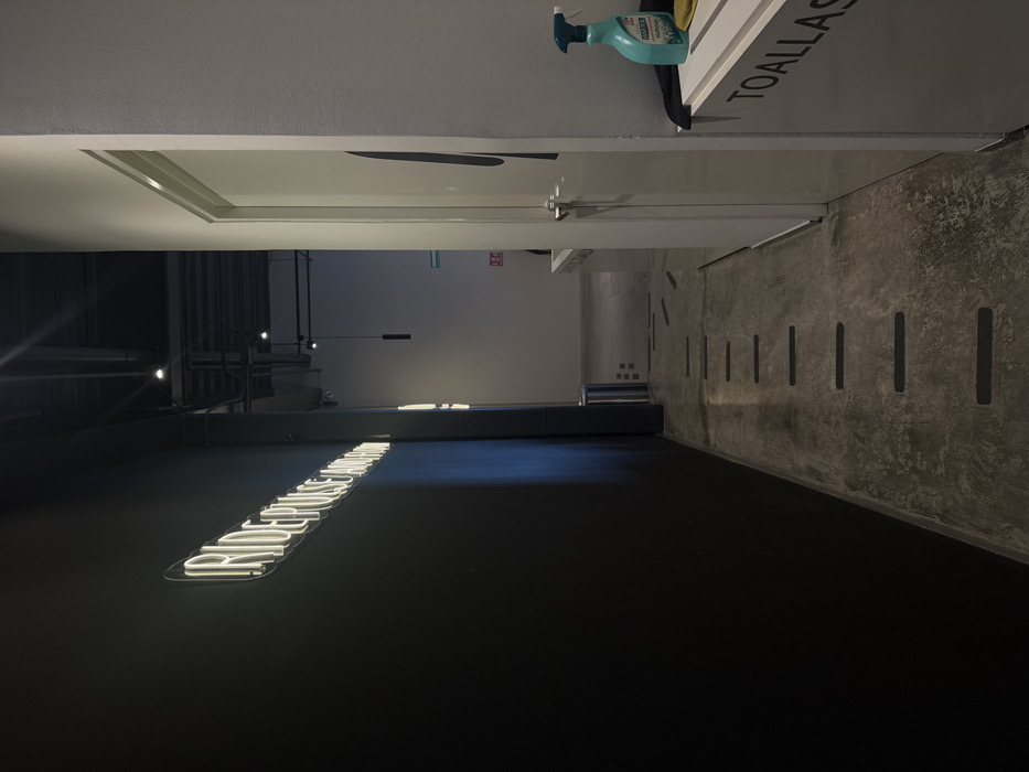 The image depicts an interior hallway or corridor within a modern building. The specific location within Cuernavaca, Mexico, is not discernible from the visual evidence. The left wall is dark gray or black, featuring a horizontally mounted, white neon sign displaying the text "RIDE. PULSE. AND FLOW." The ceiling above reveals exposed ductwork, electrical conduits, and multiple recessed spotlights, along with several suspended black cylindrical pendant lights. The floor is concrete, marked with a linear series of uniformly spaced, dark gray or black rectangular strips that extend into the background. On the right, a light gray or white wall contains a closed white door with a silver handle. A vertical black graphic, resembling an elongated numeral "1" or a blade shape, is present on the door's surface. Adjacent to the door, a white counter-height structure is visible, bearing the word "TOALLAS" in black capital letters on its front face. On the surface of this structure, a light blue spray bottle, identified as Lysol brand, rests next to a yellow sponge and a dark cloth. Further into the hallway, a silver cylindrical waste receptacle stands on the left. A red fire extinguisher is mounted on the far right wall, below a green emergency exit sign. Another white counter-like structure is partially visible in the background on the right. No individuals are present in the scene.