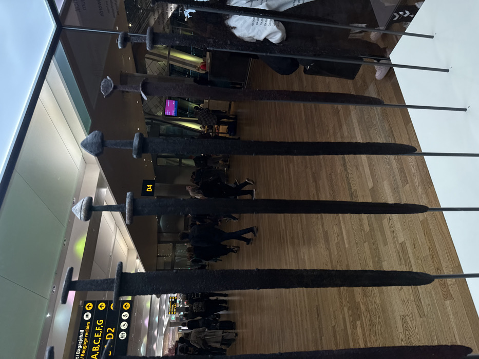 The image depicts the interior of a modern airport terminal, identified by signage as Oslo Airport (OSL) in Gardermoen, Norway. In the immediate foreground, a display presents at least seven dark, textured, ancient-style swords, vertically oriented with distinct pommels and crossguards, mounted on slender dark rods embedded in a white base. The flooring consists of light brown, reflective wooden planks. The ceiling is high, light-colored, and features integrated lighting. In the midground and background, numerous individuals are present, moving through the terminal. They are casually dressed, and some are observed with luggage, including a dark rolling suitcase. Overhead yellow directional signage indicates "Bagasjehall / Baggage reclaim" pointing towards areas "A, B, C, E, F, G" and "D1 D2," alongside universal symbols for stairs/escalators, elevators, and disabled access. Another yellow sign for "D4" is visible further within the terminal. The environment is brightly illuminated by artificial overhead lighting. On the far right, a person wears a white shirt with text partially visible, including "GA 000" and "Gardermoen."