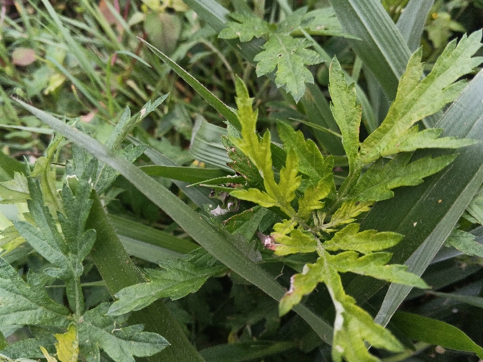 The scene depicts a close-up view of dense foliage in Khna, Cambodia. The primary subject is a cluster of herbaceous plants featuring deeply lobed, serrated leaves that display varying shades of green, from a vibrant yellowish-green to a darker forest green, indicating new growth and mature leaves. These plants are interspersed with and surrounded by longer, linear, strap-like leaves characteristic of grasses or similar monocots, which fill the background and foreground, contributing to a lush, verdant environment. No people, animals, man-made objects, or discernible actions are present in the frame. The lighting suggests natural daylight, illuminating the plant textures and colors evenly.