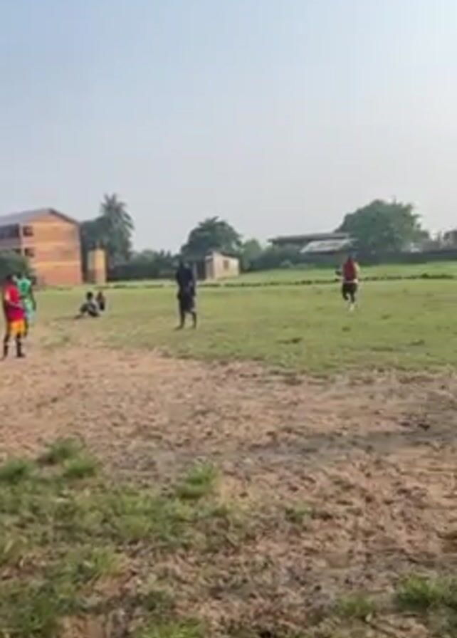 group of people playing soccer on a field with a three-story brick building in the background. The field appears to be grassy with patches of dirt and sand. The people are wearing different colored shirts and some have shorts and socks. Some are standing while others are kicking a ball. The camera is positioned near a set of goalposts, and the view pans across the field. The sky is clear and the sun is shining.