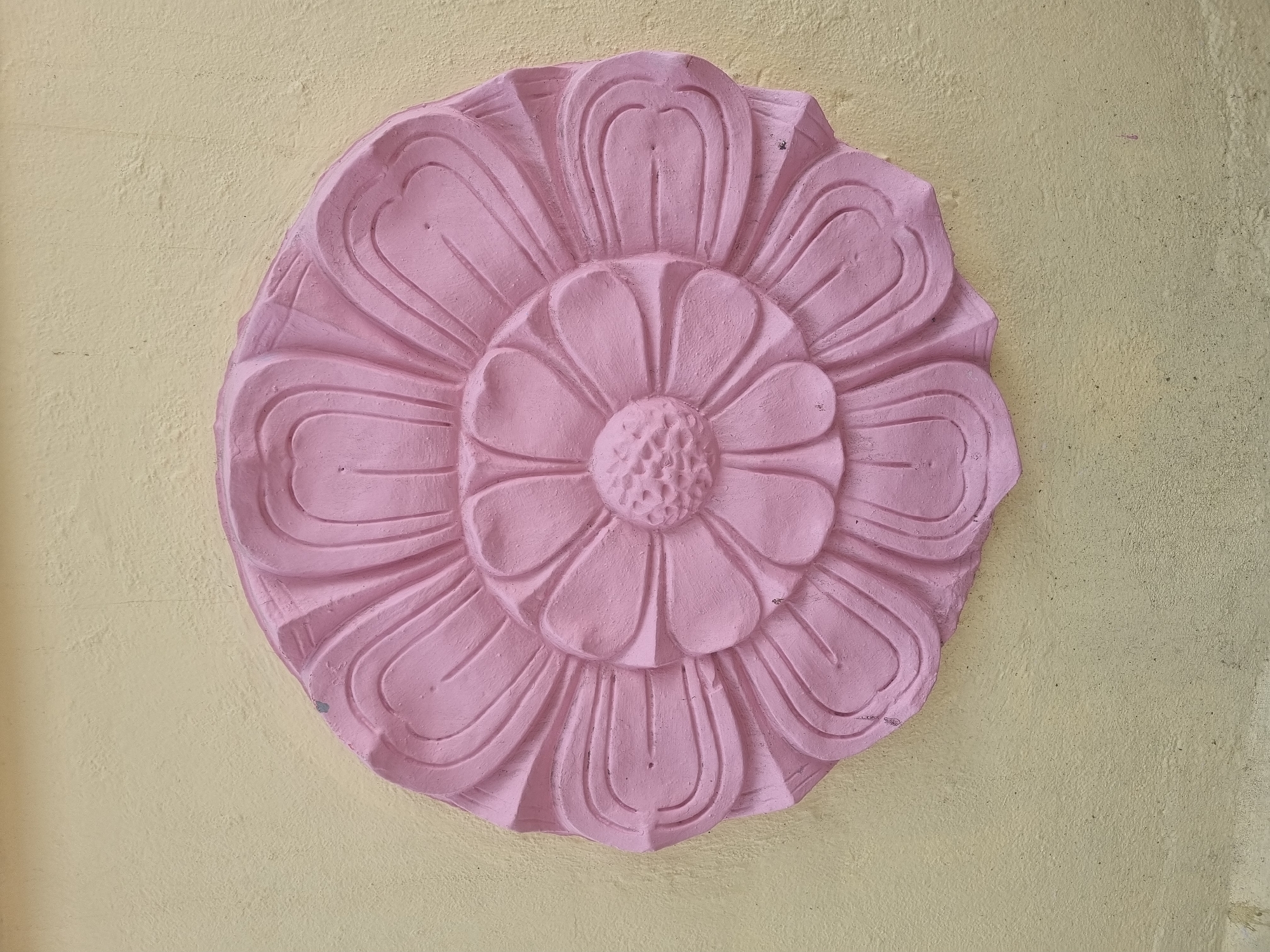 A pink, stylized flower carving is affixed to a light yellow painted wall